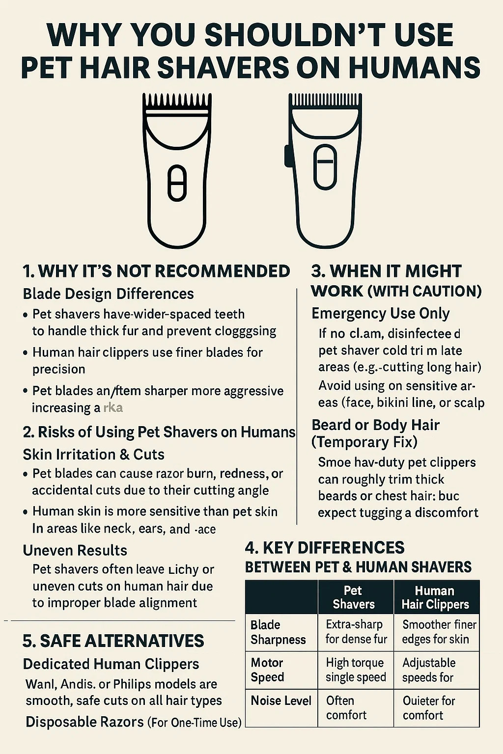 Những chiếc máy cạo râu thú cưng có thể chứa vi khuẩn, Dander thú cưng hoặc nấm từ việc sử dụng trước đó, có nguy cơ nhiễm trùng nếu được sử dụng cho con người.