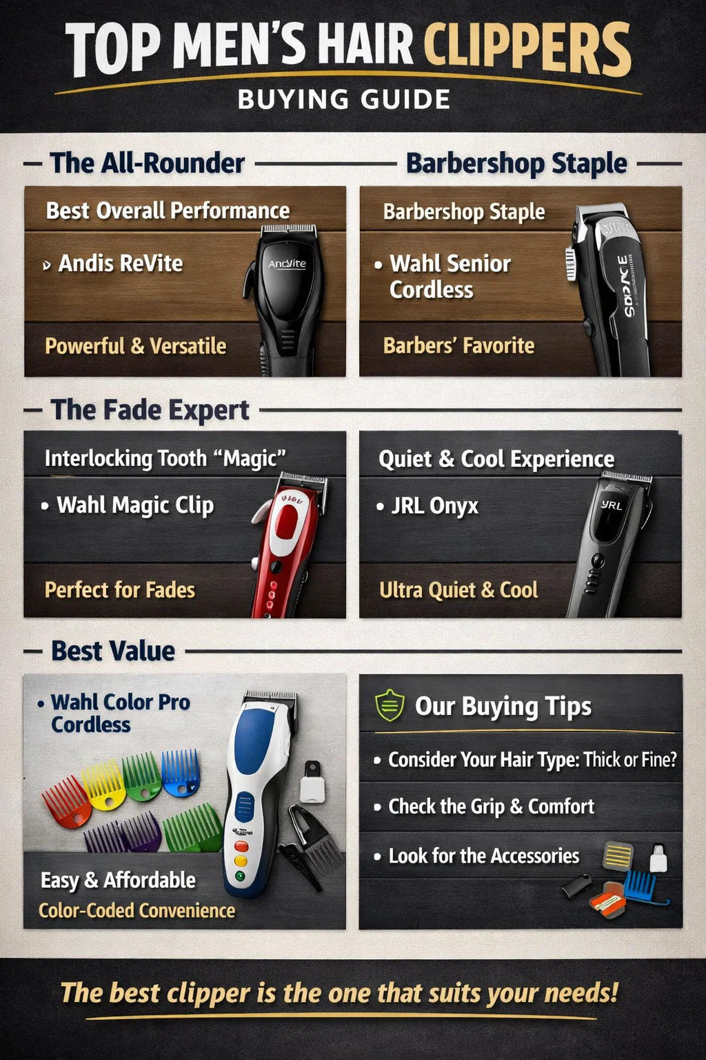 Hiệu suất tổng thể tốt nhất (ví dụ: Andis ReVite): Đây là tùy chọn hàng đầu hiện có trên thị trường. Nó kết hợp hoàn hảo giữa động cơ mạnh mẽ cấp chuyên nghiệp với sự tiện lợi khi sử dụng tại nhà. Không chỉ có tốc độ cắt cực nhanh mà lưỡi dao còn có thể tháo rời dễ dàng để vệ sinh, giúp ngay cả những người mới bắt đầu cũng có thể trải nghiệm cảm giác cao cấp.