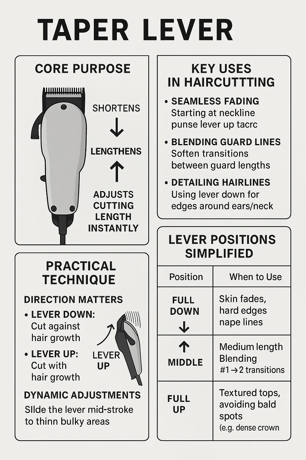 Đòn bẩy trên tông đơ cắt tóc (thường được gọi là cần gạt côn hoặc cần điều chỉnh lưỡi dao) phục vụ chức năng chính xác cần thiết cho các thợ cắt tóc chuyên nghiệp. Dưới đây là một sự cố thực tế: