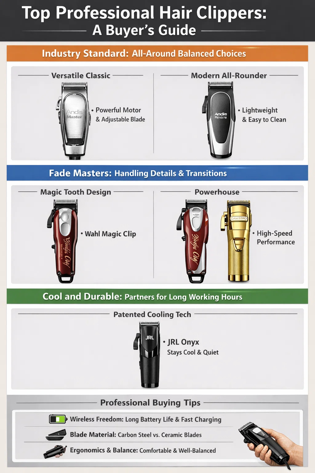 Nếu bạn đang tìm kiếm cấp độ chuyên nghiệp tông đơ cắt tóc , thợ cắt tóc thường ưu tiên sức mạnh, độ sắc bén của lưỡi dao và khả năng xử lý cân bằng. Dưới đây là một số mẫu máy chuyên nghiệp có hiệu suất tốt nhất hiện có trên thị trường: